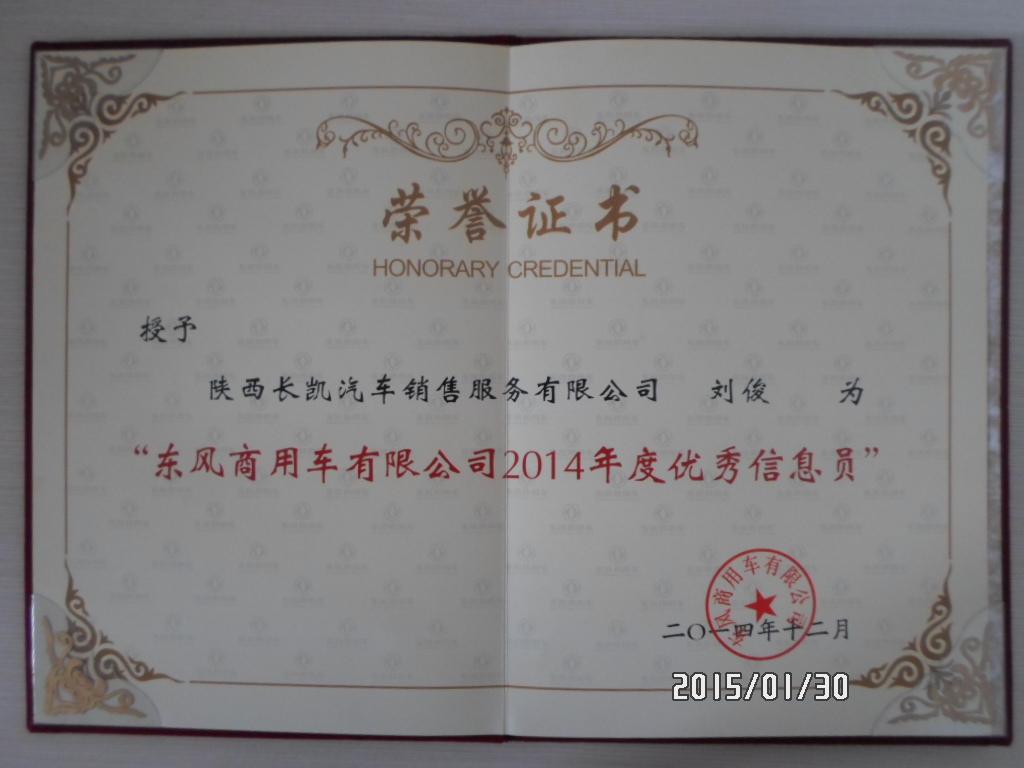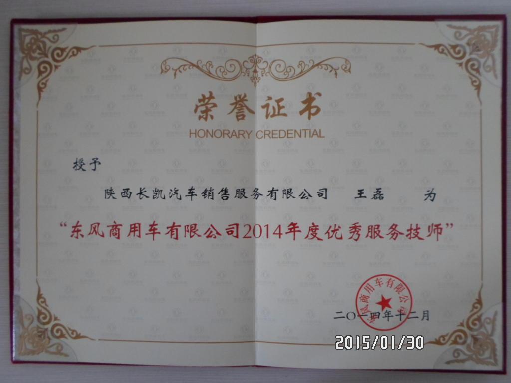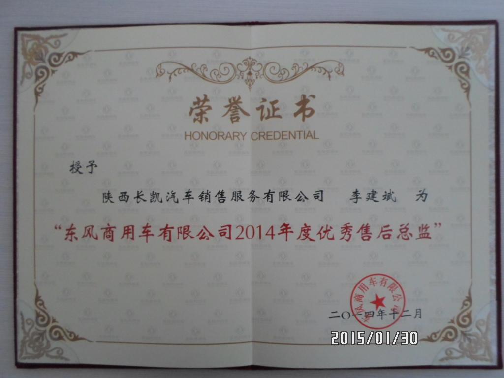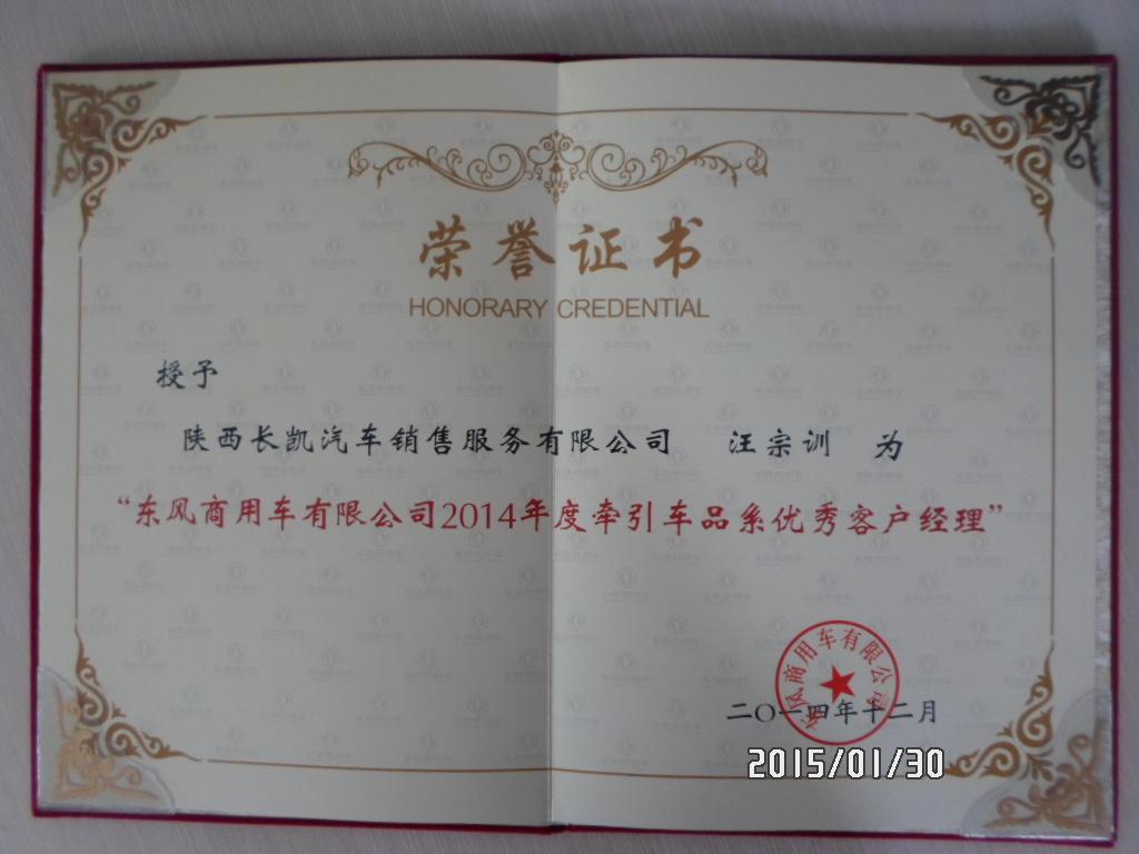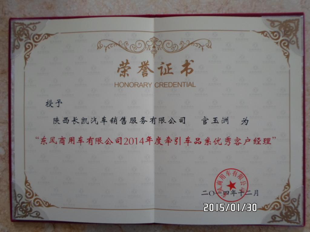 热烈祝贺陕西长凯汽车销售服务有限公司荣获:东风商用车有限公司2014年度个人奖